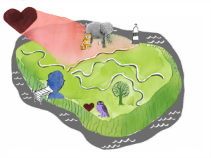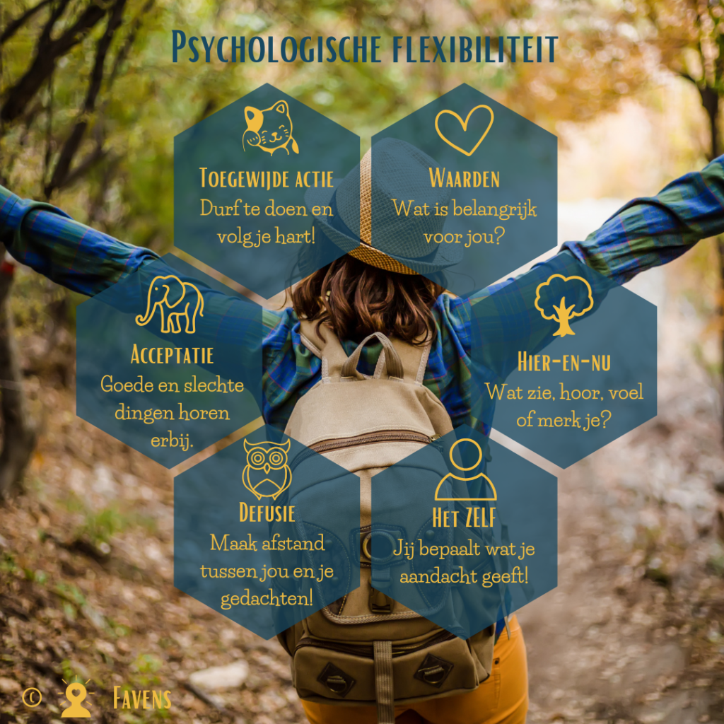 Bij ACT laat ik je kennis maken met jouw waarden, het hier-en-nu, het zelf, defusie, acceptatie en toegewijde actie (met de symbolen: het hart, de boom, het zelf, de uil, de olifant en de kat). Het hart staat voor alles wat je belangrijk vindt. De boom geeft je informatie vanuit je zintuigen (wat hoor, zie, ruik, proef en voel je?). De uil is heel wijs en probeert je te beschermen, maar soms slaat hij door. Wanneer geeft de uil je wijze raad? En wanneer is het kletspraat en kun je beter even niet naar hem luisteren? De kat is eigengereid, best wel nieuwsgierig en zorgt goed voor zichzelf. De kat volgt hiermee gemakkelijk de weg van het hart. De olifant heeft een sterke rug en kan hierop dingen (ver)dragen die je niet kunt veranderen. Met zijn slurf kan hij de kletspraat van de uil opzij blazen.
